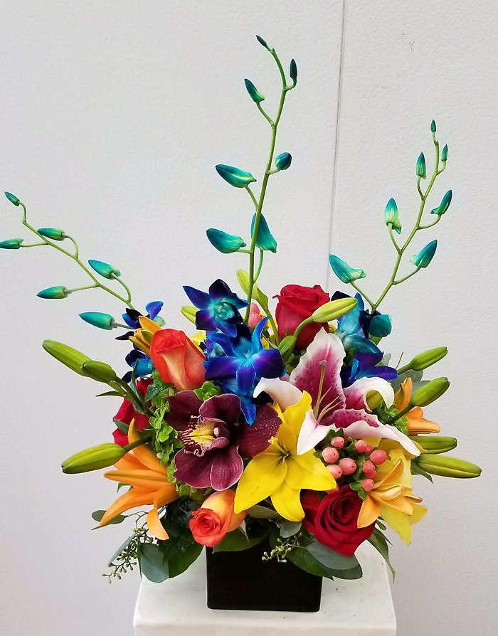 This modern tropical beauty creates a splendid display thats perfect for special celebrations. Arrangement includes stargaizers, roses, lilies, green hydrangeas, dendrobium orchids, coffee beans, and tropical greeneries artistically arranged in a black contemporary container. Approximately 18 H X 15 W. EBS-0094