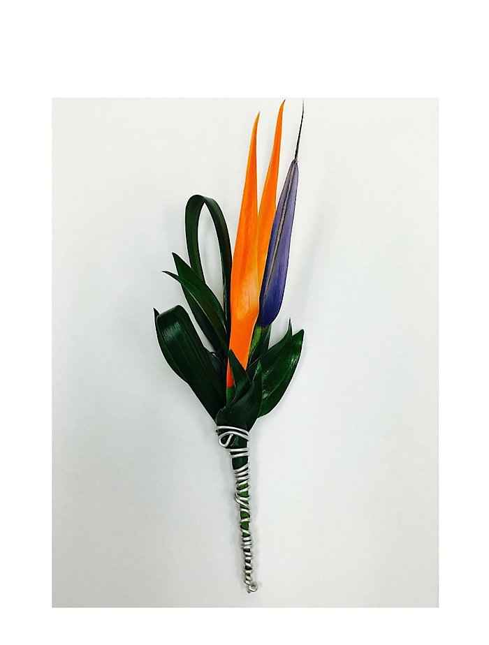 Our Parakeet Boutonniere is created with a parakeet bloom, accented by greenery and decorative silver wire. Its a traditional pin on.